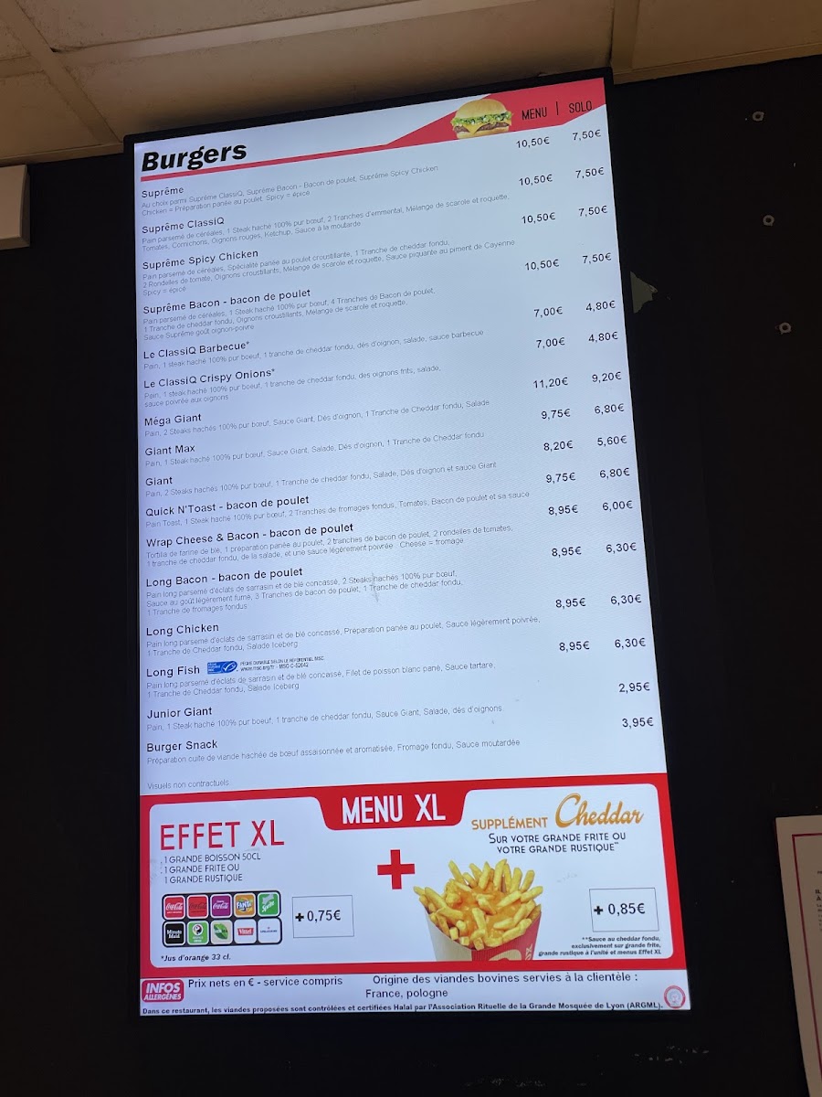 Quick Créteil Préfecture, located in the heart of Créteil, offers a flavorful fast-food experience blending classic French touches with vibrant fast-casual dining. The menu highlights a variety of crispy, golden fries—ranging from long, crunchy sticks to rustic wedges infused with subtle garlic and spice, delivering a robust texture and warm, savory flavors. For a fresher option, the petite salad combines mâche, frisée, and delicate carrot tagliatelles, creating a light, refreshing balance alongside hearty burgers.